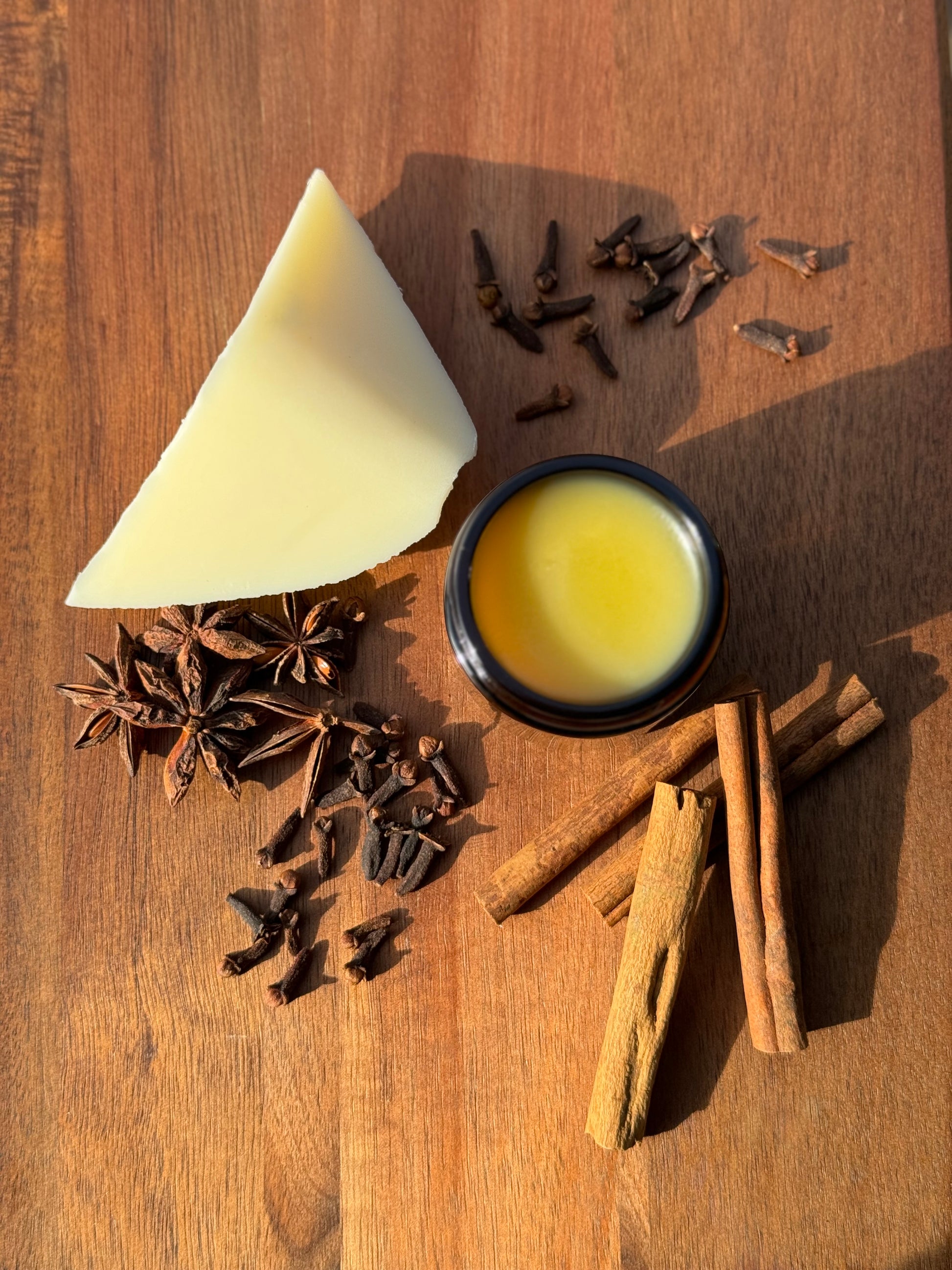 Tallow, an organic blend of cinnamon, star anise, ginger root, cardamom, clove, and vanilla bean, organic marshmallow root infused jojoba oil.